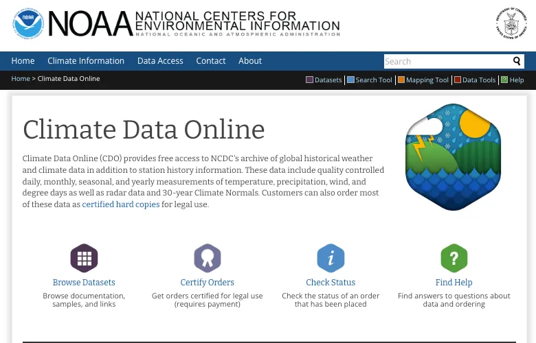 Climate Data Online (CDO) is a portal hosted by the National Centers for Environmental Information (NCEI)/NOAA that provides access to the most thorough publicly available archive of global historical weather and climate data.