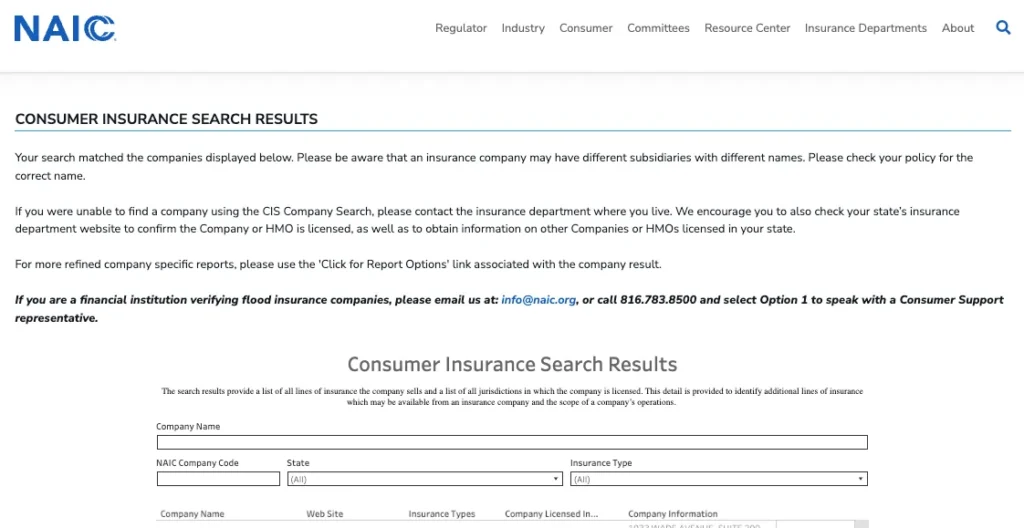 Screenshot from the official NAIC Consumer Insurance Search interface, illustrating how to look up licensing and company information for U.S. insurers. Source: content.naic.org