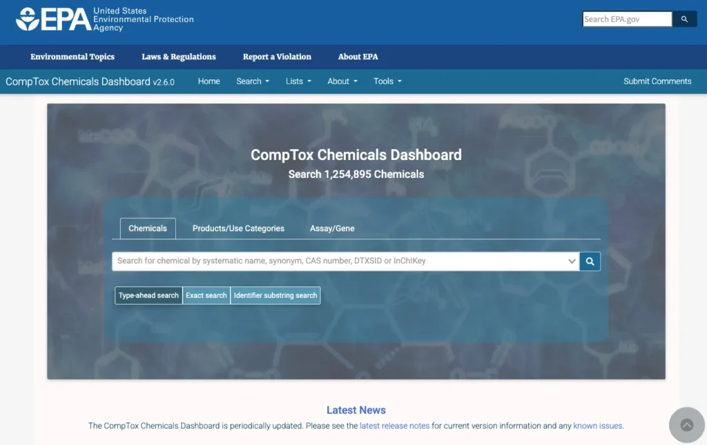 Screenshot of the CompTox Chemicals Dashboard interface provided by the U.S. Environmental Protection Agency (EPA). Source: EPA.gov