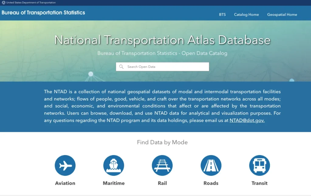 - Bureau of Transportation Statistics (BTS): National Transportation Atlas Database (NTAD) – https://geodata.bts.gov/
